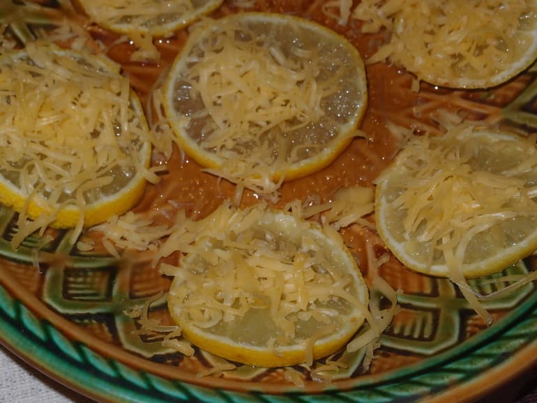 Лимон нарезать тонкими кольцами, удалить косточки. Посыпать сахаром, а сверху — тертым сыром.
