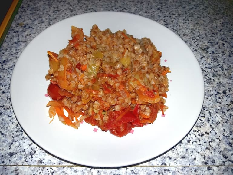 В горшочек выкладываем гречку и тушеные овощи. Все перемешиваем и добавляем кипяток, чтобы вода покрывала на 1 см. Накрываем крышкой. Ставим в холодную духовку. Готовим 30 минут с момента нагрева духовки до 180 градусов.