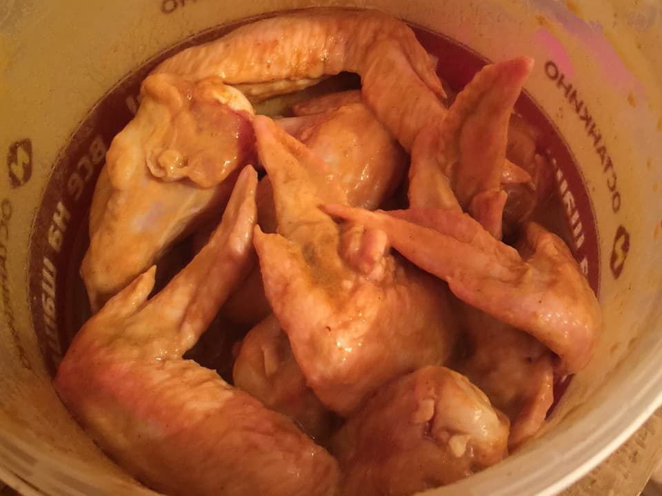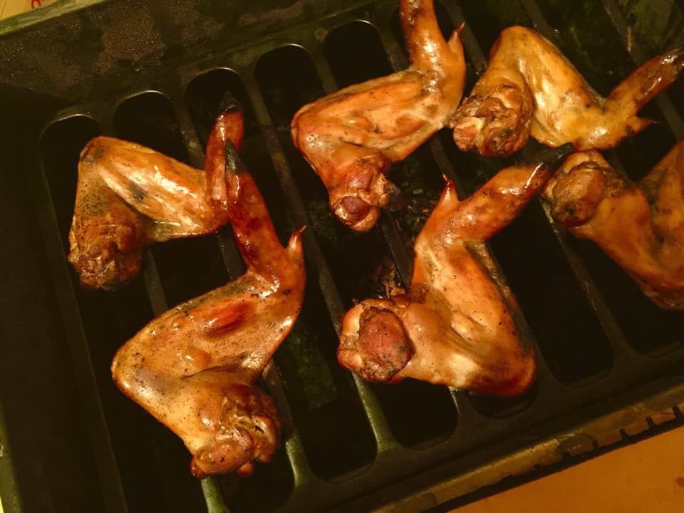 За полчаса до приготовления замачиваем щепу. На дно коптильни выкладываем отжатую щепу, а на решетку верхнего уровня кладем ножки. Закрываем коптильню, через 10 минут выпускаем первый дым. Готовим минут 30-40 до золотистого цвета рыбы.