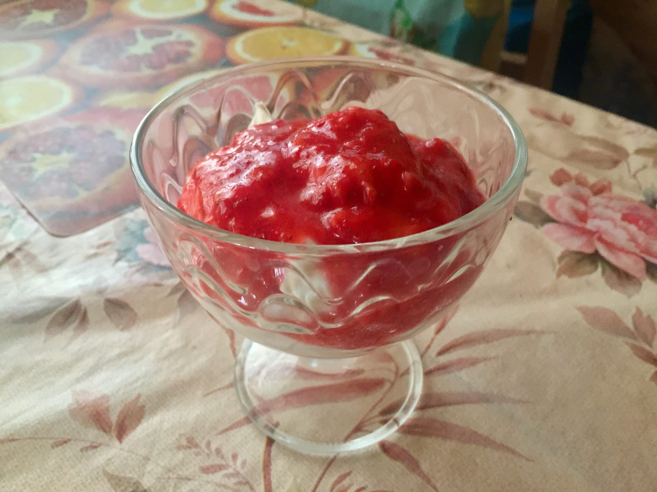 В креманку положить творожок и полить клубничным пюре.