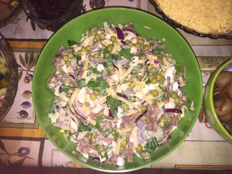 Говядину отварить с добавлением лаврового листа, гвоздики, душистого перца и черного перца горошком в течение 1,5 часа или до готовности. Готовое мясо остудить и порвать на небольшие волокна. Яйца отварить вкрутую и нарезать кубиками. Сыр на тереть на крупной терке. Огурцы порезать колечками, а лук — полукольцами. Петрушку измельчить. Мясо, яйца, сыр, соленые огурцы, лук, зеленый горошек и петрушку смешать в салатнице и заправить майонезом. Готово!