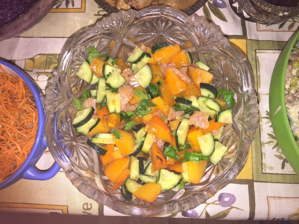 Хурму режем на тонкие дольки, огурец — кольцами или полукольцами. Филе форели режем на небольшие кусочки и добавляем к огурцам и хурме. Добавляем измельченную зелень. Посыпаем перцем, поливаем соевым соусом и оливковым маслом.