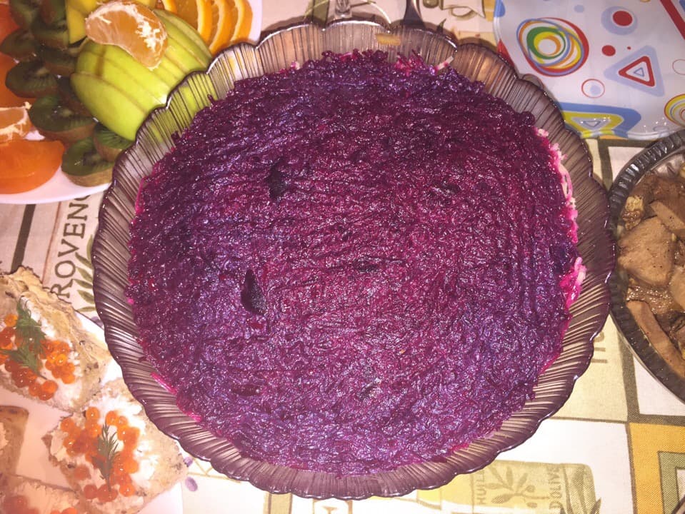 Овощи и яйца отвариваем, остужаем и трем на крупной терке. Половину свеклы трем на крупной терке, а половину — на мелкой и отжимаем от лишнего сока. Лук режем полукольцами. Филе селедки — кубиками. Яблоко и сыр — трем на крупной терке.