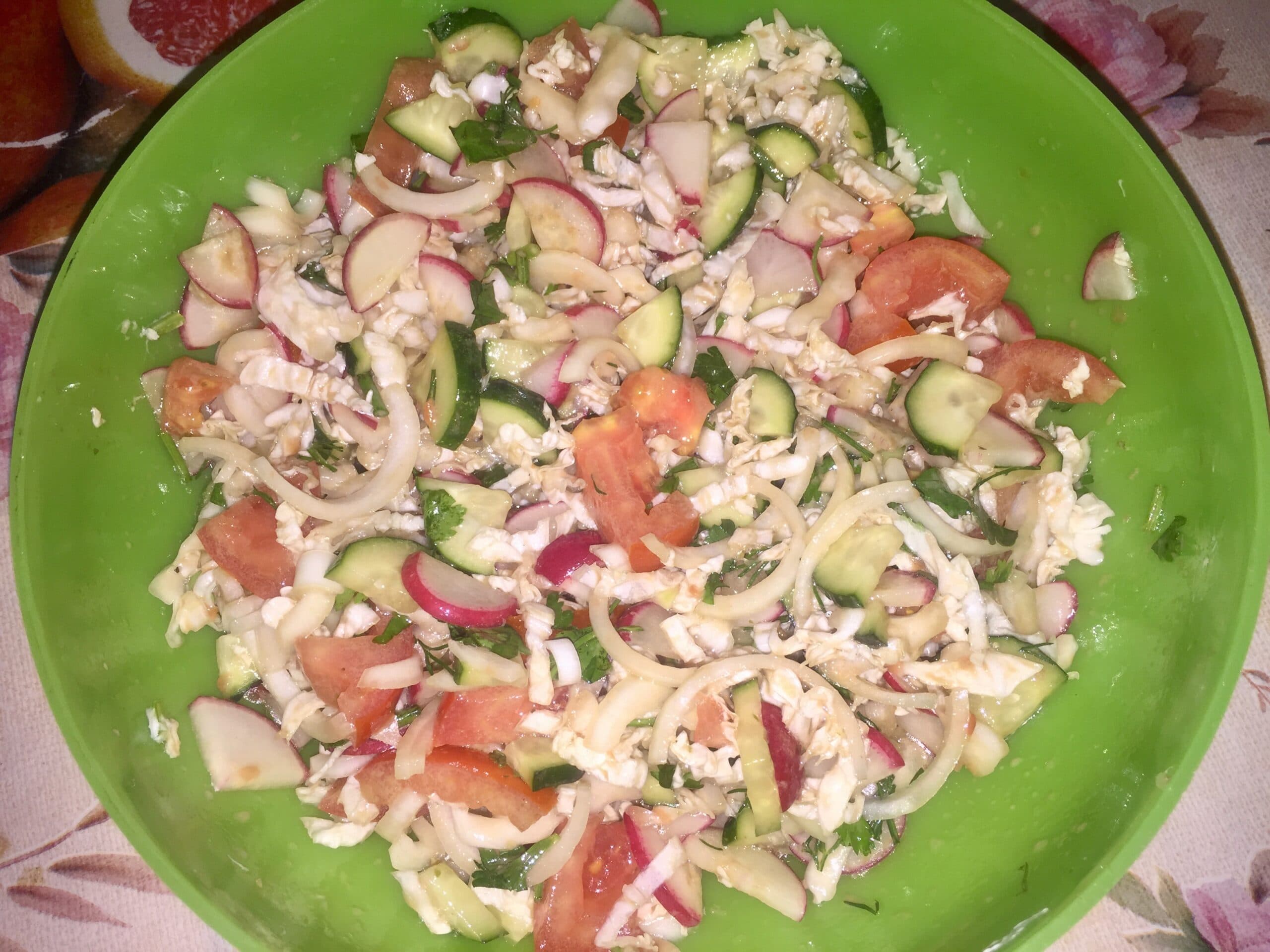 Нарезать помидоры, огурцы, редиску, пекинскую капуста и петрушку. Заправить соевым соусом и растительным маслом. Перемешать.