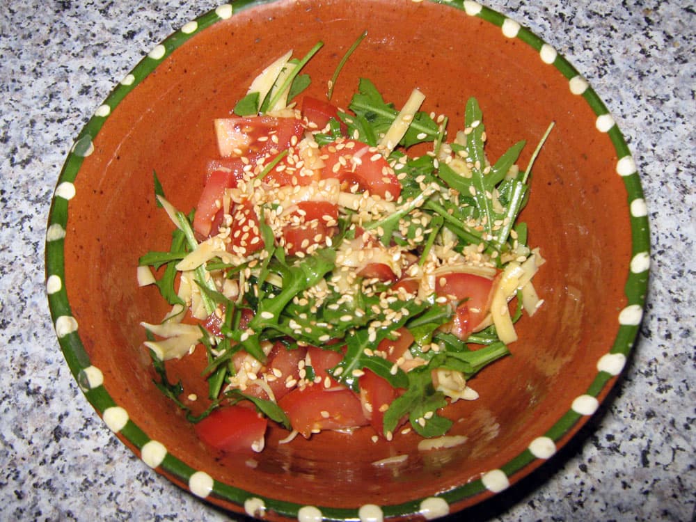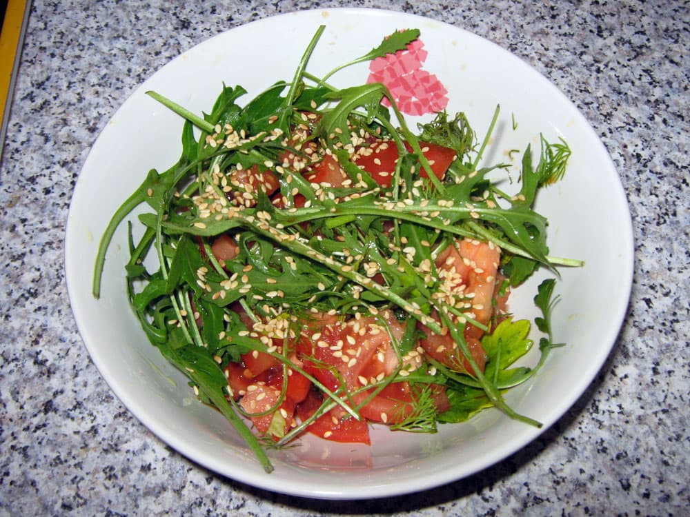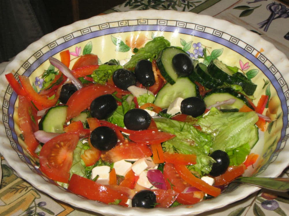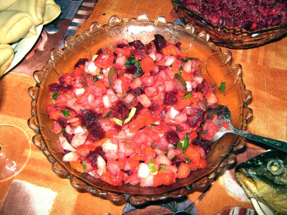 Картофель, морковь и свеклу отвариваем, чистим и режем кубиками. Огурцы тоже режем кубиками. Лук мелко режем. Всем смешиваем, заправляем соевым соусом и растительным маслом.