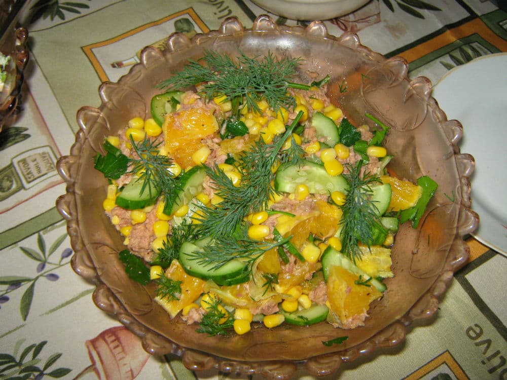 Апельсин очистить от кожуры и семечек, порезать на небольшие кусочки. Сложить в салатницу. Огурец нарезать полукольцами и добавить к апельсину. Тунец размять вилкой и вместе с жидкостью выложить в салатницу. Добавить кукурузы. Заправить соевым соусом и подсолнечным маслом и перемешать и украсить зеленью перед подачей.