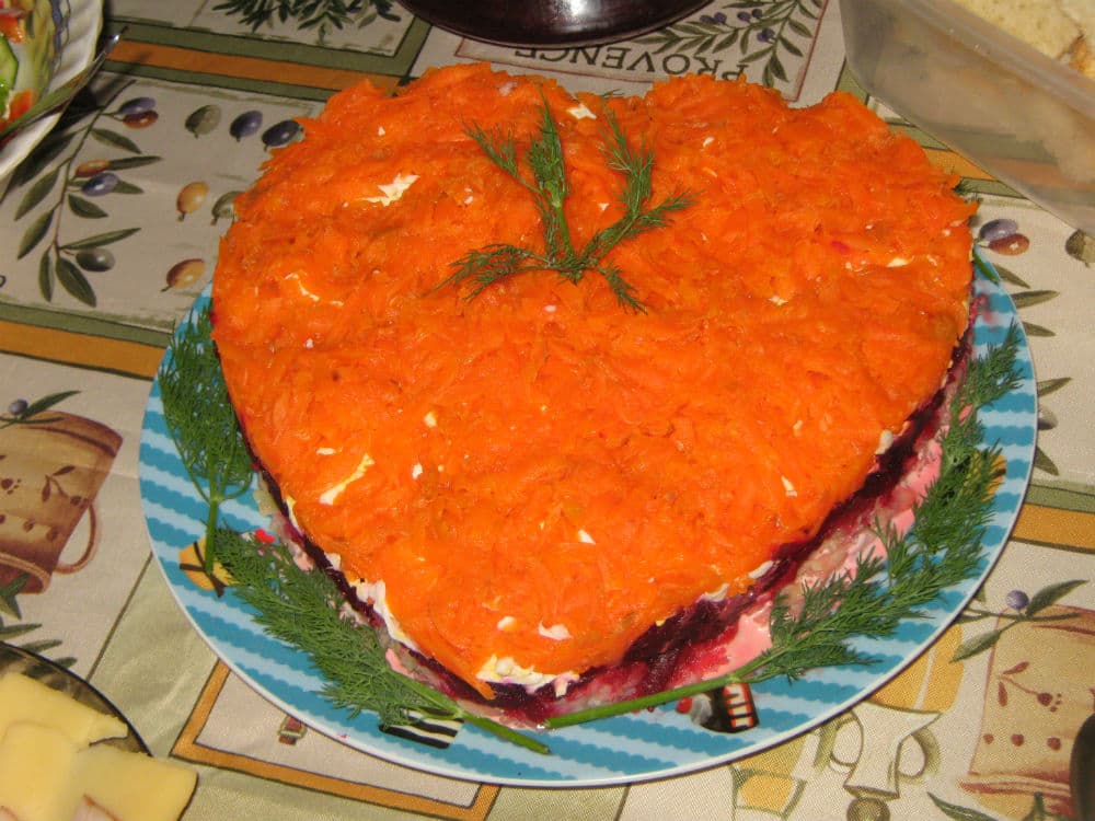 Картофель, морковь, свеклу и яйца отварить, остудить, почистить и потереть на крупной терке. Куриный окорочок отварить и порвать мясо на кусочки. Чернослив залить кипятком на минут 5, отцедить и порезать на небольшие кусочки. В разъемную форму в виде сердца выкладываем ингредиенты слоями.