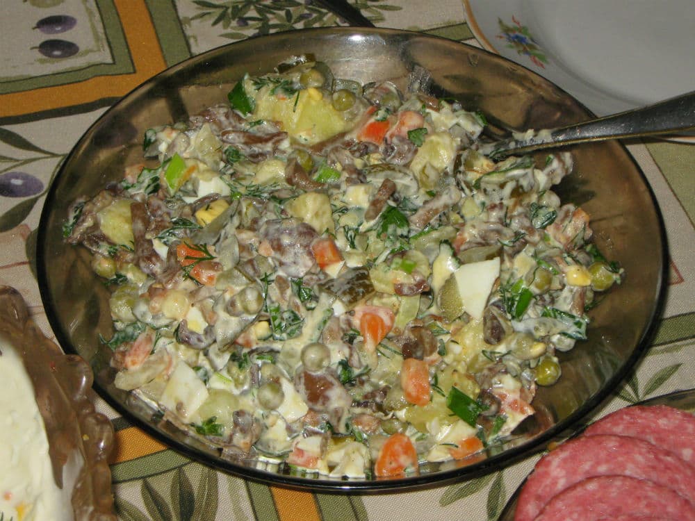 Опята пожарить на растительном масле. Морковь и картофель отварить, почистить и порезать кубиками. Маринованные огурцы тоже нарезать кубиками. Смешать овощи с жареными опятам, добавить зеленый горошек и измельченный зеленый лук. Заправить майонезом и посолить по вкусу.