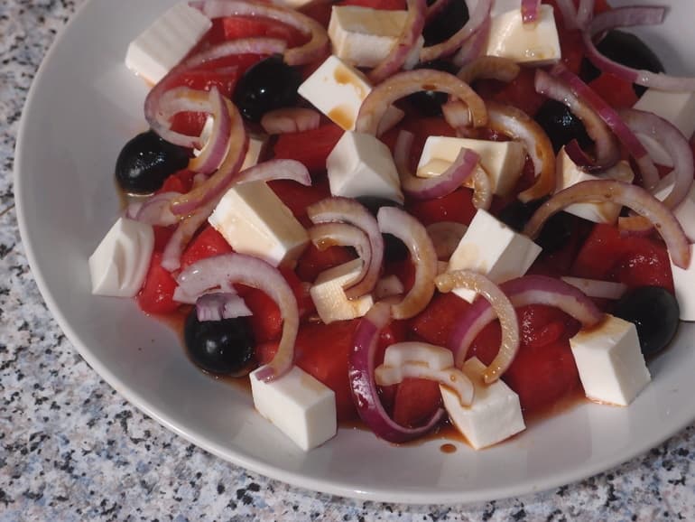 Арбуз очищаем от кожуры и косточек, режем кубиками. Выкладываем на тарелку. Сверху выкладываем несколько маслинок и кубики сыра Фета. Сверху — красный лук, нарезанный полукольцами. Добавляем пару капель бальзамика и сбрызгиваем соевым соусом. Заправляем растительным маслом.