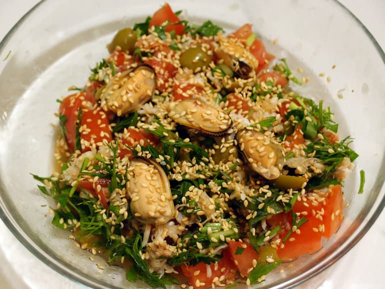 Сцеживаем крабовое мясо от рассола и выкладываем в салатницу. Помидор режем кубиками и добавляем к крабовому мясу. Измельчаем зелень и отправляем в салатницу. Все перемешиваем, заправляем соевым соусом и кукурузным маслом. Украшаем мидиями и посыпаем жареным кунжутом.
