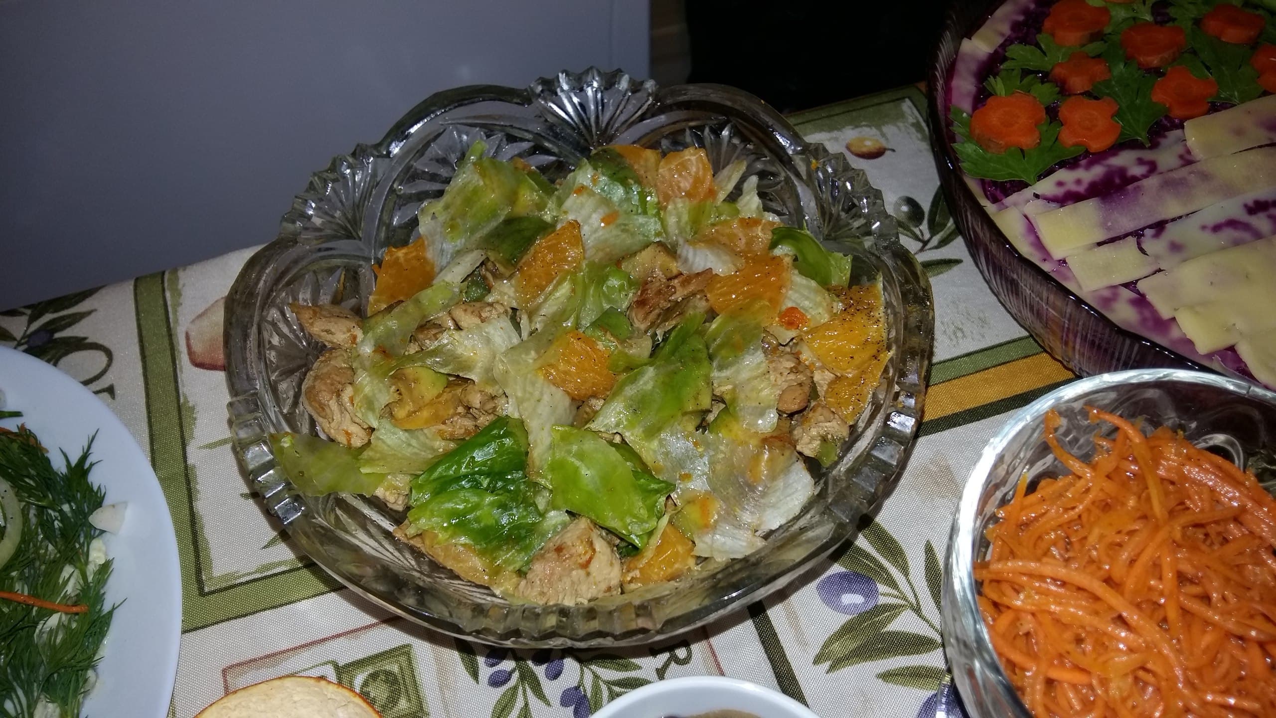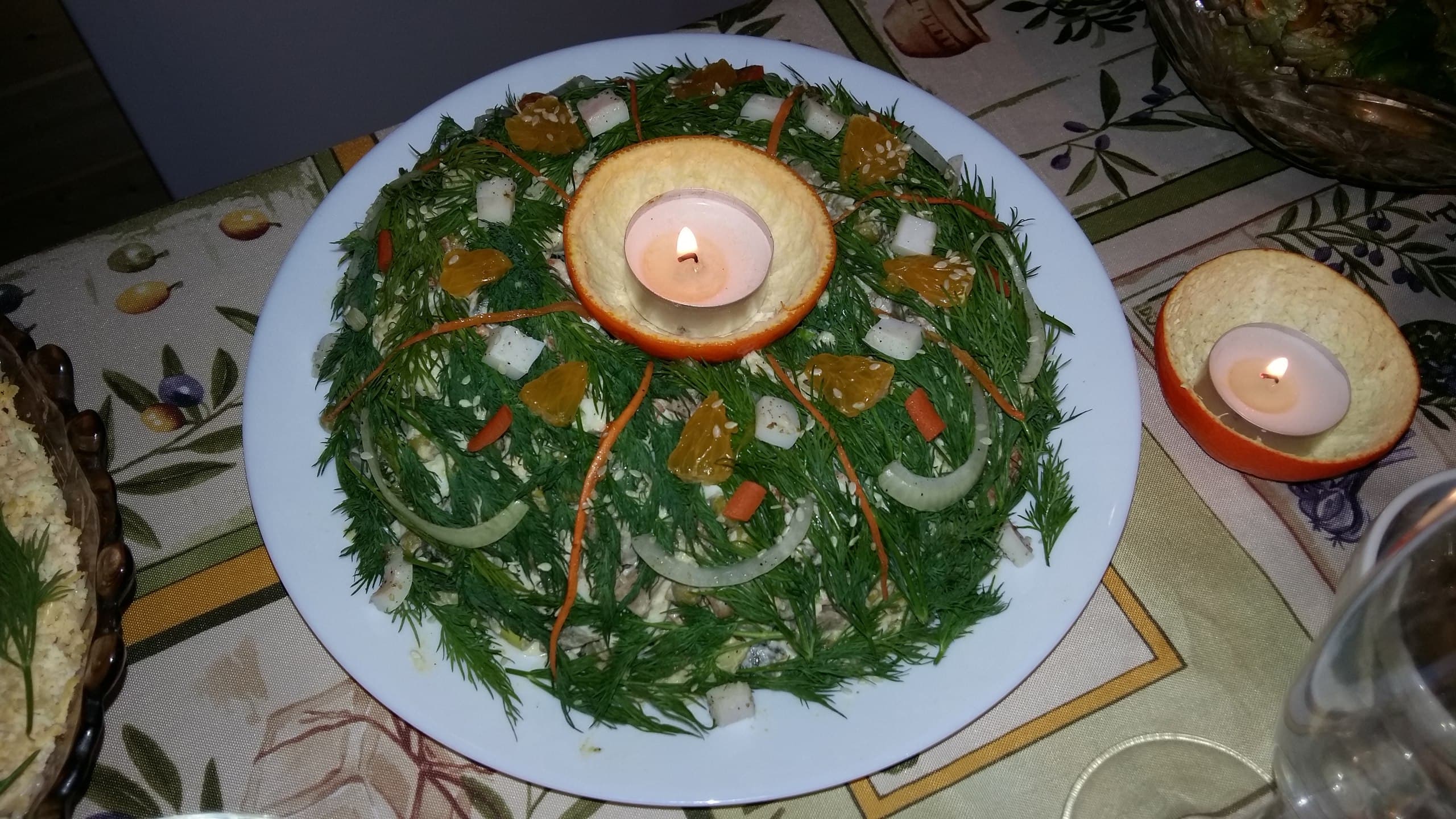 свиной язык, картофель, морковь и яйца отварить, почистить и нарезать кубиками. Так же кубиками нарезаем огурцы. Все смешиваем в салатнице, добавляем зеленый горошек, зеленый лук. Заправляем сметаной и домашним майонезом. В центр блюда ставим стакан и выкладываем салат в виде кольца. Украшаем укропом, кусочками кальмаров, морковью по-корейски, кусочками мандаринок. В центр ставим подсвечник из половинки мандаринки, ставим в него свечу и зажигаем.
