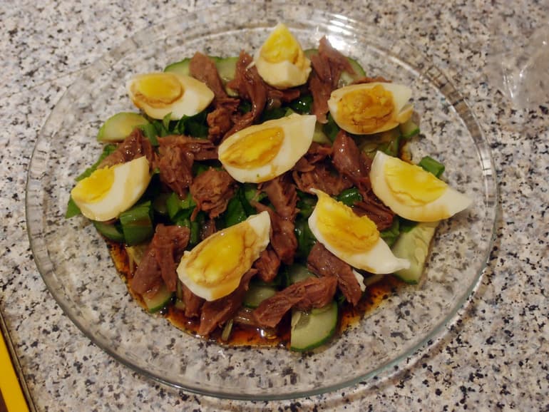 Режем огурцы и выкладываем на тарелку, сверху выкладываем измельченную черемшу и кусочки говядины. Вареные яйца режем на четвертинки и выкладываем сверху салата. Поливаем соевым соусом и заправляем растительным маслом.