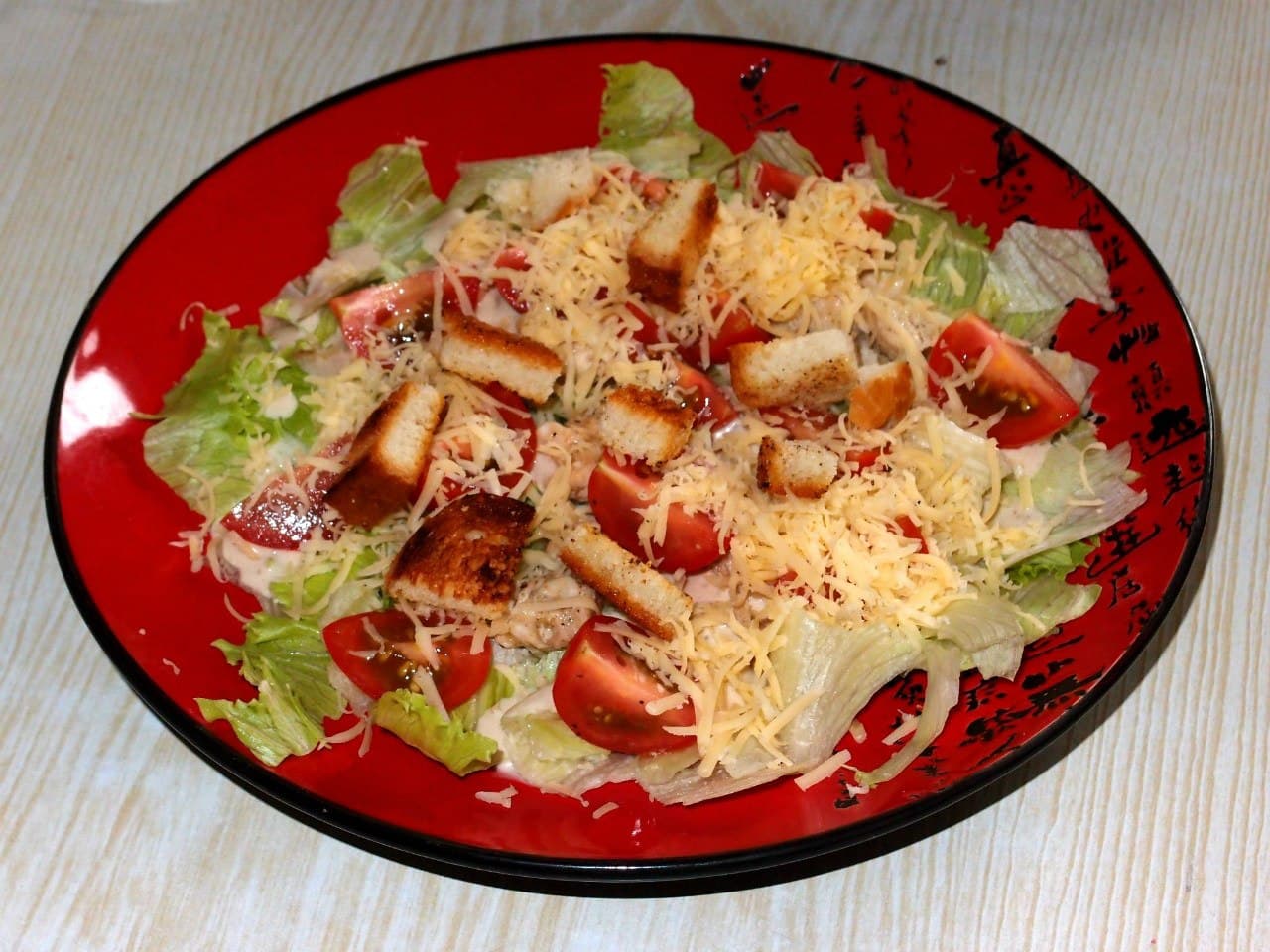 Батон режем кубиками. В растительное масло добавляем измельченный чеснок и оставляем настаиваться. Это лучше всего сделать в начале приготовления, чтобы масло получило аромат и вкус чеснока. Когда масло настоится, добавляем его на сковородку (следим, чтобы на сковородку не попал чеснок). Разогреваем и выкладываем нарезанный хлеб. Обжариваем сухарики до румяного цвета. Листья Айсберга рвем руками на небольшие кусочки и выкладываем на тарелку. Куриное филе выкладываем сверху на салат. Помидорки черри разрезаем на половинки и раскладываем сверху сардин. Поливаем соусом. Сверху посыпаем тертым сыром. Перед подачей выкладываем сухарики.