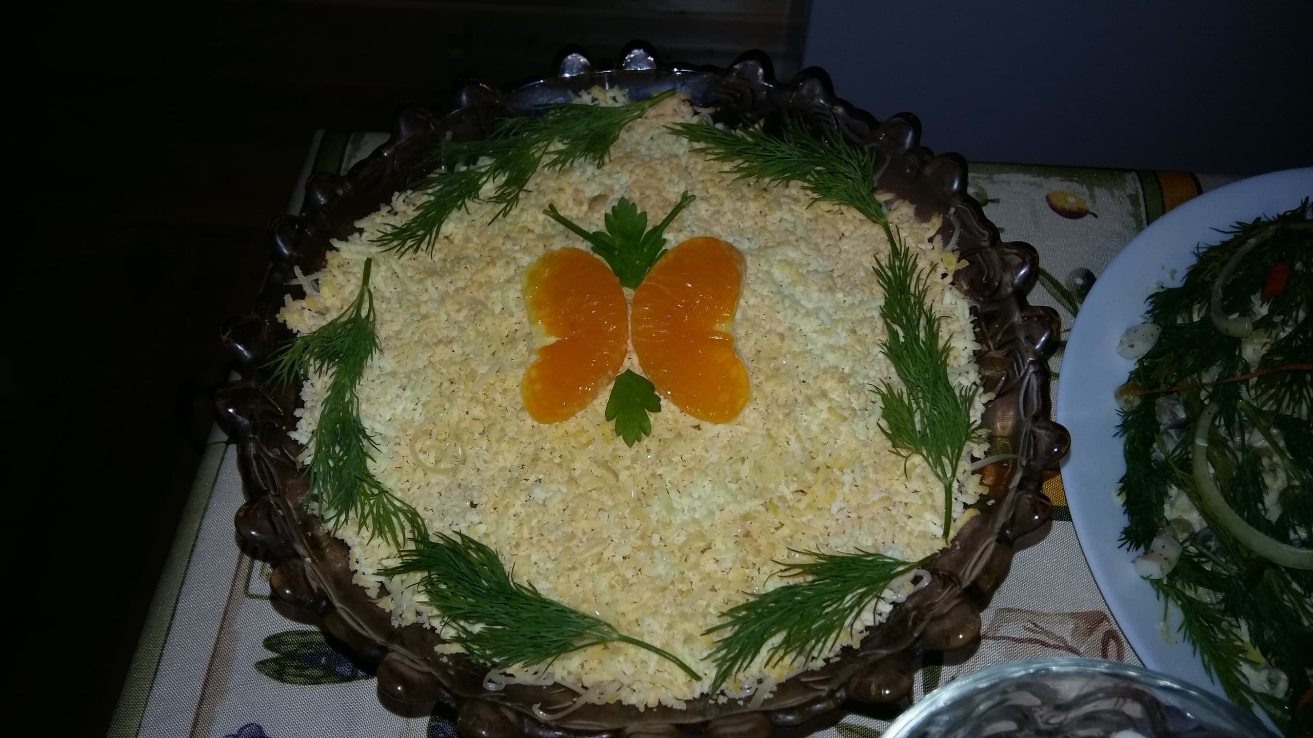 Тунец размять и выложить на дно салатницы и смазываем капелькой майонеза. Майонез должен быть жидким, чтобы хорошо пропитал салат небольшим количеством. Следующим слоем выкладываем лук, нарезанный полукольцами. Далее выкладываем тертые белки и снова смазываем майонезом. Затем у нас идет тертая вареная морковь. Я люблю, чтобы ее было побольше. Морковь тоже смазываем майонезом. Следующий слой — тертый сыр. Совсем чуть-чуть смазываем майонезом и посыпаем тертыми желтками. Я украшала дольками мандаринки в виде бабочки и зеленью.
