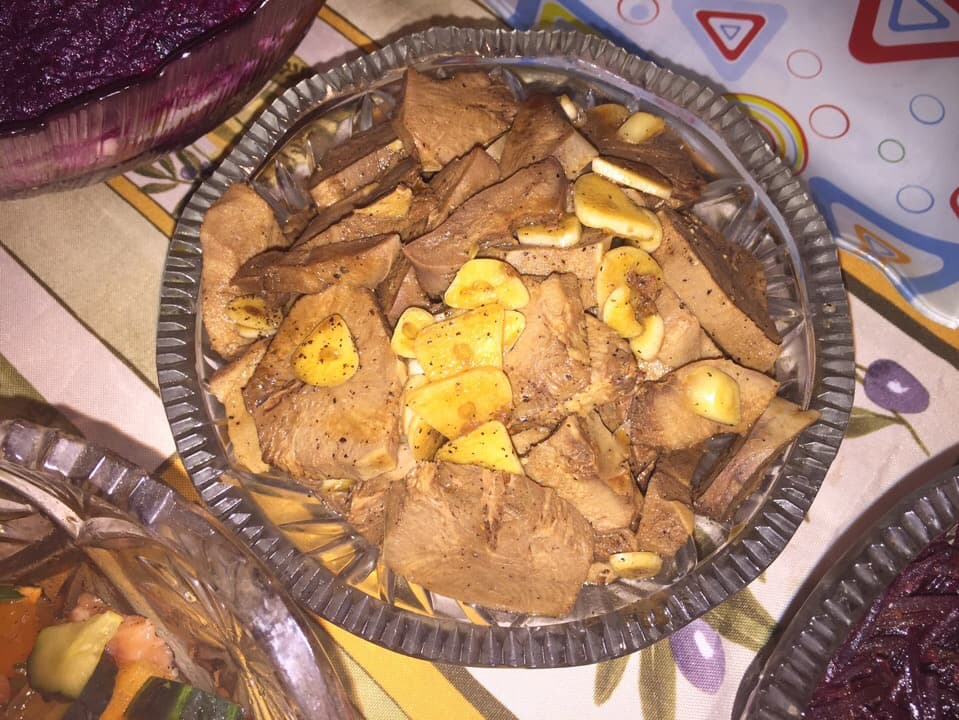 Язык отварить, почистить, порезать ломтиками, добавить чеснок колечками, перец и соевый соус. Сложить в чашу маринатора, запустить на 2-3 цикла. А еще лучше после оставить в маринаторе на 30 минут. Так будет вкуснее.
