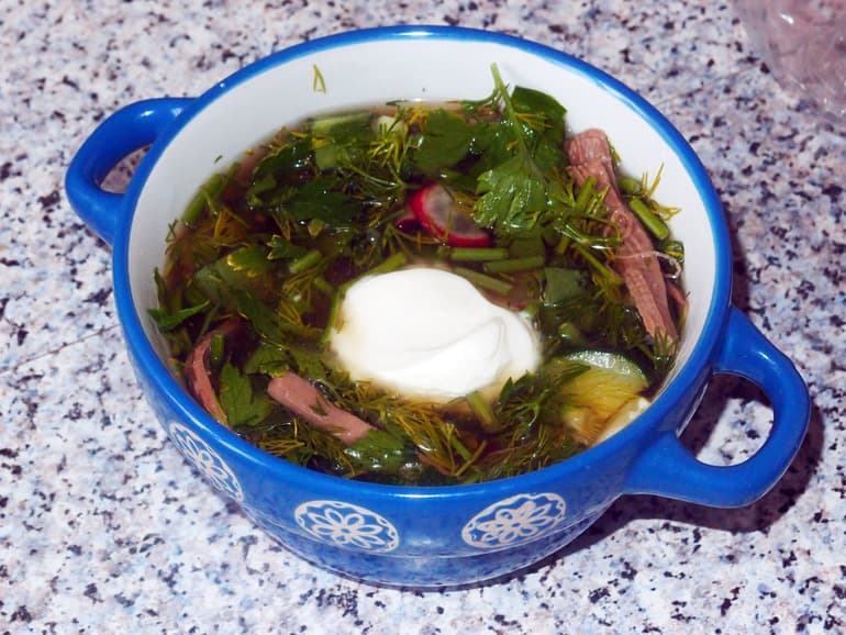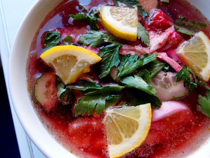 Варим куриные бедрышки. Бульон не выливаем — он нам пригодится. Варим свеклу. Бульон также не выливаем. Варим яйца. Всем вареным ингредиентам даем немного остыть. Свеклу и яйца чистим, с бедрышек снимаем шкурку. Помидоры режем небольшими дольками и складываем в кастрюлю. Огурцы режем полукольцами и отправляем к помидорам. Свеклу режем небольшими брусочками. Курицу рвем руками на небольшие кусочки. Яйца режем полукольцами и отправляем также в кастрюлю к мясу и овощам. Затем все перемешиваем. Основа готова. Теперь готовим бульон. Берем куриный бульон, свекольный отвар и минеральную воду в частях 1,5:1,5:1. Куриный бульон перед этим процеживаем. В бульон добавляем соль, перец и соевый соус. Количество специй регулирем на свой вкус. В тарелочки выкладываем основу для свекольника, заливаем бульоном, посыпаем рубленной петрушкой и украшаем ломтиками лимона. При желании можно добавить сметану.