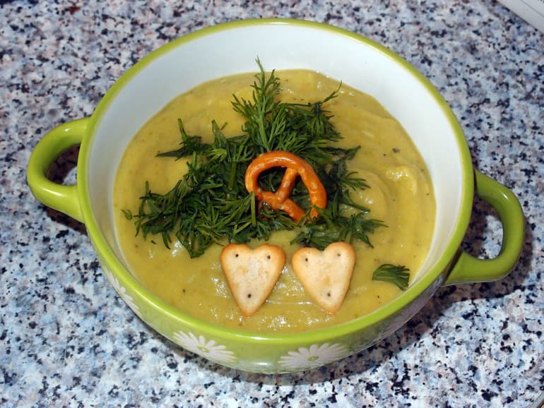 В кастрюлю наливаем растительное масло. В него кладем мелко нарезанный лук, морковь и картофель, нарезанные кубиками. Перемешиваем и немного обжариваем. Цветную капусту разделяем на небольшие соцветия и выкладываем в кастрюлю. Заливаем бульоном. Бульон может быть любой: из птицы, из мяса, овощной. Можно даже просто водой залить. Если бульона мало или он жирный, то добавляем воды. Перемешиваем, накрываем крышкой и варим до готовности. Когда овощи почти готовы, добавляем измельченный чеснок и петрушку. Перемешиваем и продолжаем варить еще 5-7 минут. Пока варится, с косточек снимаем мясо и рвем на небольшие кусочки. Затем процеживаем бульон и отставляем. Он нам еще понадобится. Все овощи пюрируем при помощи блендера, добавляем молоко или сливки и снова взбиваем. Затем добавляем соль по вкусу, перец и куркуму и снова чуток взбиваем. Потом вливаем бульон и доводим до нужной консистенции. Добавляем куриное мясо. Размешиваем. Ставим на огонь и доводим до кипения. Готово! Перед подачей украшаем по желанию. У меня был измельченный укроп и соленый крекер и снеки.