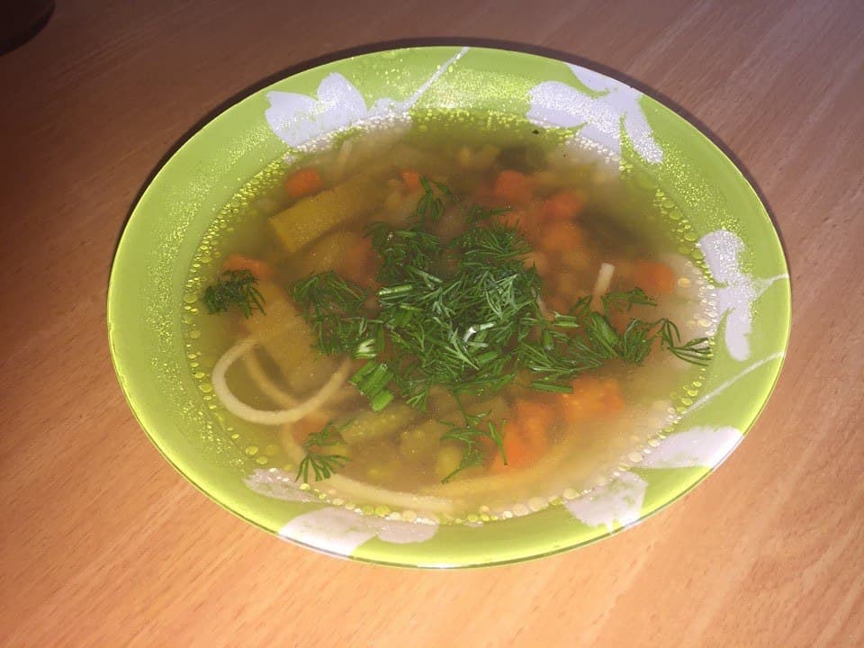 Сварить куриный бульон. На оливковом масле обжарить лук, добавить в бульон и спагетти. Варить до состояния аль-денте, в конце добавить зеленый горошек, черный молотый перец и соль по вкусу, и кинзу. Готово!