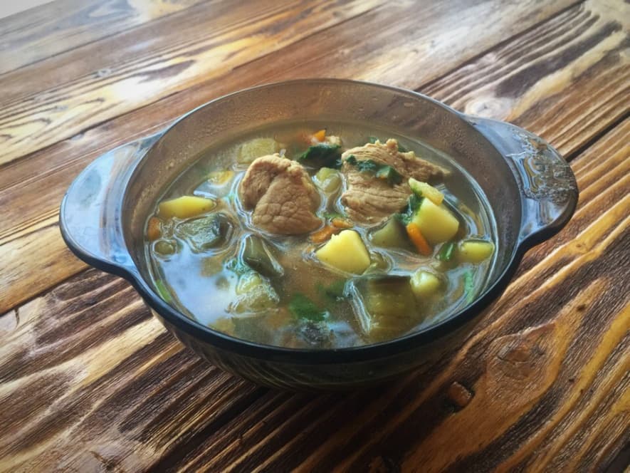 В чашу мультиварки добавляем растительное масло и мелко нарезанный лук. Включаем программу «Жарка» или «Экспресс», если нет «Жарки». Обжариваем несколько минут. Дальше добавляем нарезанную соломкой морковь, перемешиваем, обжариваем пару минут и наливаем немного воды, чтобы овощи были покрыты водой и тушились. Готовим 5-7 минут. В это время подготавливаем мясо. Срезаем жир, пленки и нарезаем средними кусочками. Отправляем к зажарке. На этом этапе добавляем щепотку хмели-сунели и 1-2 ст.л. соевого соуса. Готовим 20 минут на режиме «Тушение». При добавлении хмели-сунели ориентируемся на свой вкус, потому что эта специя у каждого производителя имеет свой вкус. Поэтому нюхаем и пробуем. Пока тушится мясо нарезаем кубиками картофель и баклажаны. Сначала добавляем к мясу картофель, перемешиваем и тушим еще 5-7 минут. Затем — баклажаны. В это же время добавляем карри, сушеный чеснок, лавровый лист и соевый соус. Перемешиваем. Тушим еще 5-7 минут, чтобы все овощи пропитались пряностями. Затем заливаем горячей водой до нужной консистенции. У меня чаша мультиварки на 4 литра и я добавила воды до самого верхнего деления. Включаем программу «Суп» и готовим минут 20 до готовности. В конце приготовления добавляем соль и перец по вкусу. Перед тем, как солить, пробуем на вкус, потому что и соевый соус, и специи содержат соль. Перемешиваем и готовим еще 5 минут. Выключаем мультиварку и добавляем мелко нарезанную кинзу. Перемешиваем, закрываем крышкой и даем настояться минут 7. Готово!