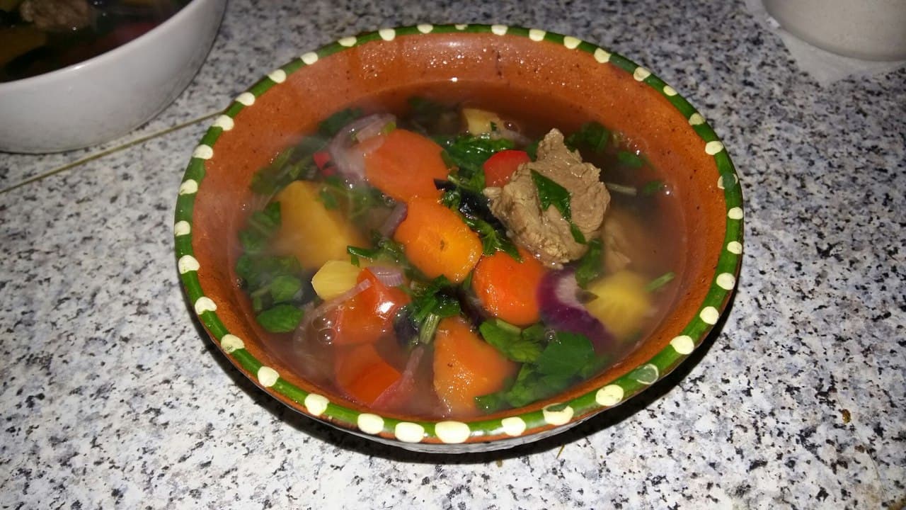 Варим минут 20 на минимальном огне, чтобы чуть булькало. Репчатый лук очень тонко режем полукольцами и добавляем к мясу. Продолжаем варить еще 20 минут. Морковь режем по диагонали крупными кусочками и добавляем в кастрюлю. На этом этапе добавляем молотую зиру и кориандр. Варим еще 30 минут. Репу чистим и режем крупными дольками. Отправляем в кастрюлю. Варим до почти готового состояние репы. Болгарский перец режем полукольцами помидоры — дольками. Выкладываем в кастрюлю. Варим еще минут 5. Затем добавляем мелко нарезанную зелень, соль по вкусу и красный лук, нарезанный очень тонкими полукольцами. Перемешиваем, доводим до кипения и выключаем огонь. Даем настояться минут 10.