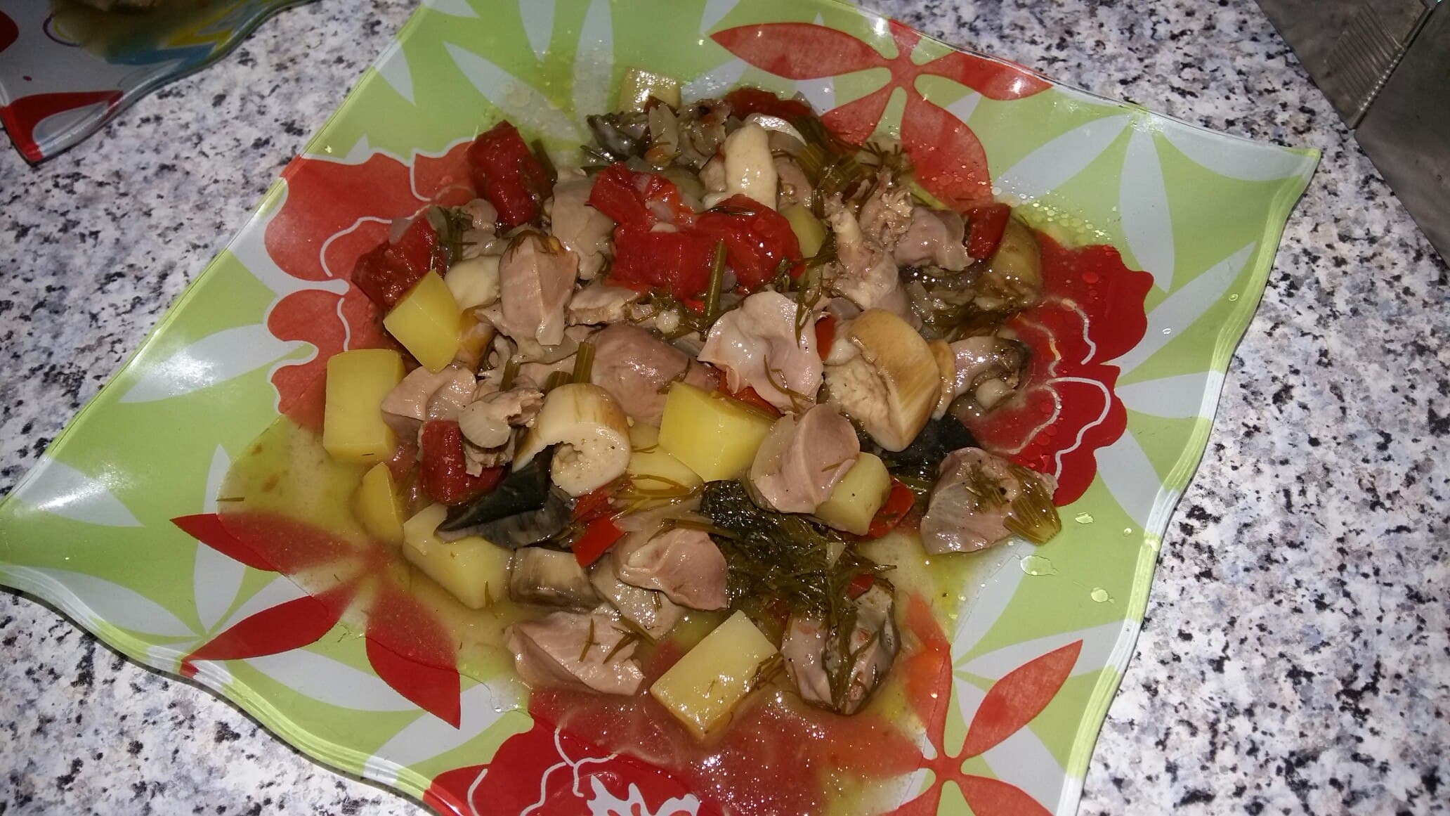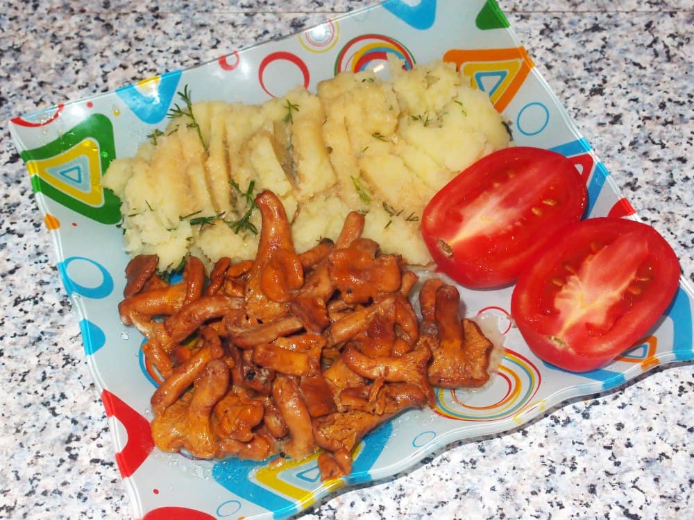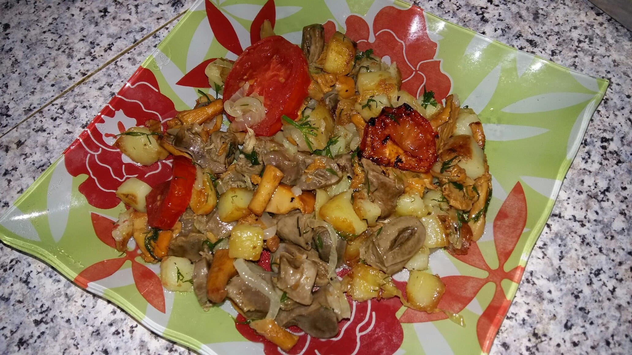 Куриные потрошки заливаем водой, доводим до кипения и варим минут 30-40. В это время картофель режем кубиками и жарим на растительном масле до готовности, чтобы была румяная и с хрустящей корочкой. Откладываем в сторону. Лук режем полукольцами и обжариваем на растительном масле до золотистого цвета. Помидоры режем на кольца и жарим в большом количестве растительного масла на максимальном огне, чтобы обжарились, но не превратились в пюре. Вынимаем шумовкой готовые помидоры. К этому времени будут готовы потрошки. Отцеживаем, режем на небольшие кусочки. Лисички моем, режем на небольшие кусочки и смешиваем с куриными потрошками. Обжариваем на растительном масле до готовности. Затем добавляем жареный лук и измельченный укроп, следом отправляем картофель и готовим на слабом огне несколько минут. Выключаем огонь и выкладываем сверху помидоры.