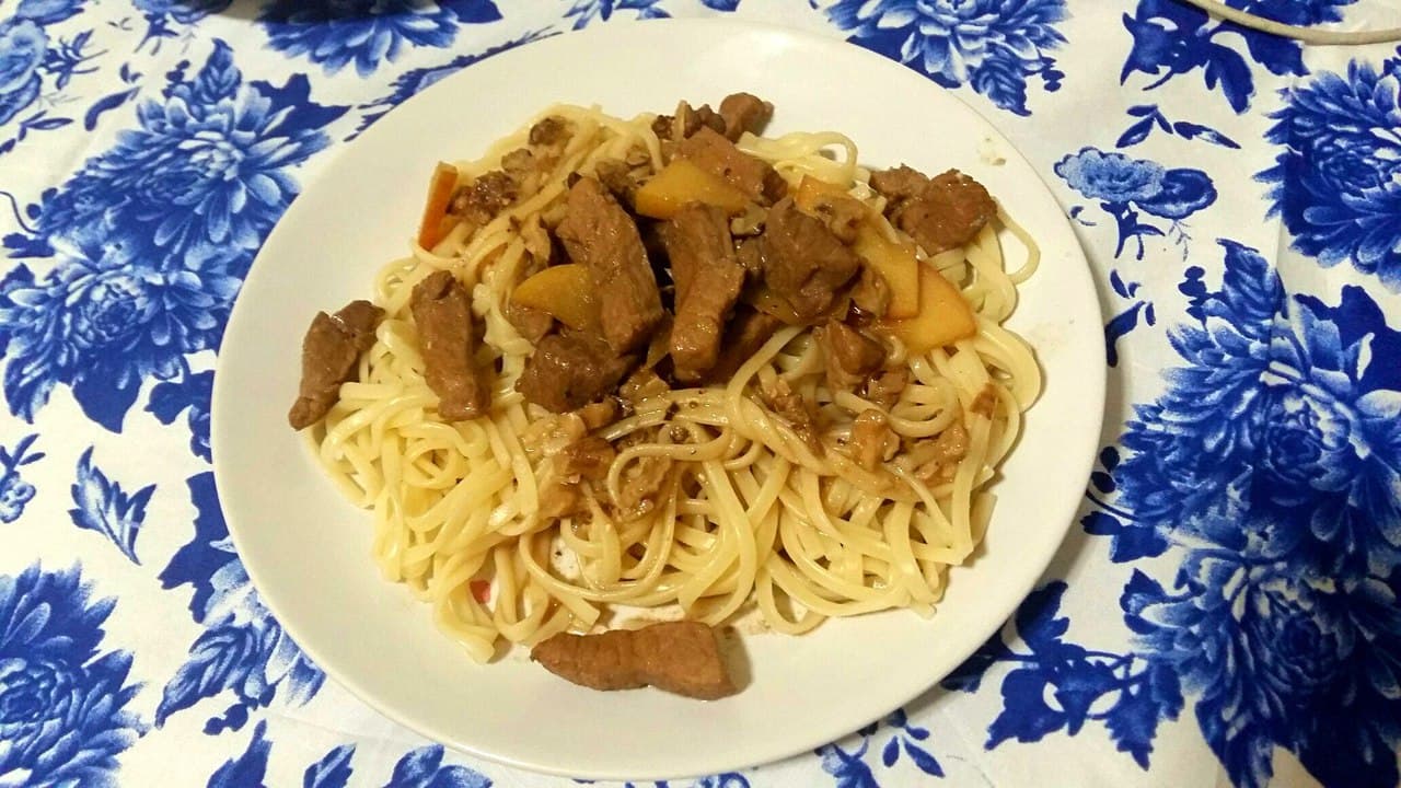 Мясо нарезать соломкой и обжарить несколько минут на растительном масле. Добавить соевый соус, сметану, специи и немного воды. Перемешать и тушить до почти готового состояния. Затем добавить яблоки, нарезанные ломтиками, и измельченные грецкие орехи. Тушим до готовности.