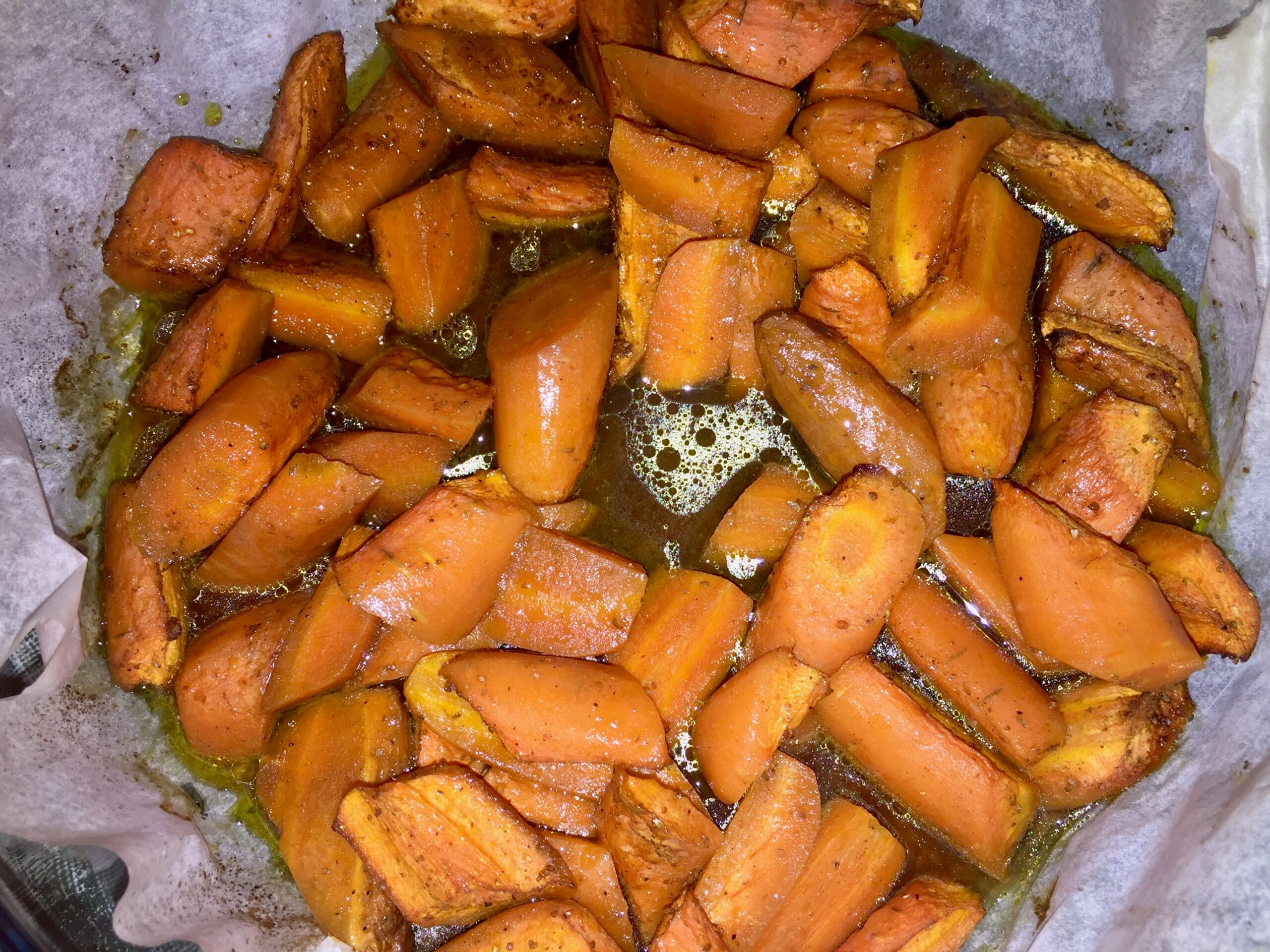 Запекать 45 минут при температуре 180 градусом с режимом «Конвекция». Затем на 15 минут включить режим «Гриль» и увеличить температуру до 200 градусов.