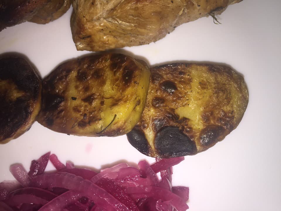 Картофель почистить и нарезать кольцами толщиной 0,5 см. Сложить в чашу маринатора или в емкость для маринования. Добавить масло и специи. В маринаторе готовить 2 цикла, а без — пару часов. Жарить на решетке при среднем жаре. Приятного аппетита!
