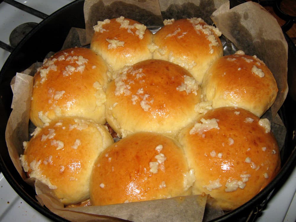 Вытаскиваем булочки из духовки и сразу же пока они самые горячие заливаем чесночной заливкой. Заливаем так, чтобы чесночное масло попало и на булочки, и между ними. Накрываем форму фольгой и оставляем на пару часов, чтобы пампушки пропитались.