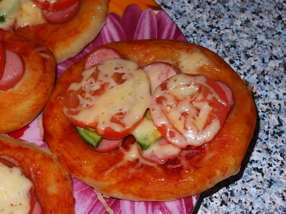 Форму для выпечки смазать растительным маслом. Тесто разделить на 6 частей и слепить маленькие лепешки. Смазать томатной пастой. Первым слоем выложить сосиски, сверху положить помидоры. Посыпаем тертым сыром. Выпекаем при температуре 190-200 градусов 15-20 минут.