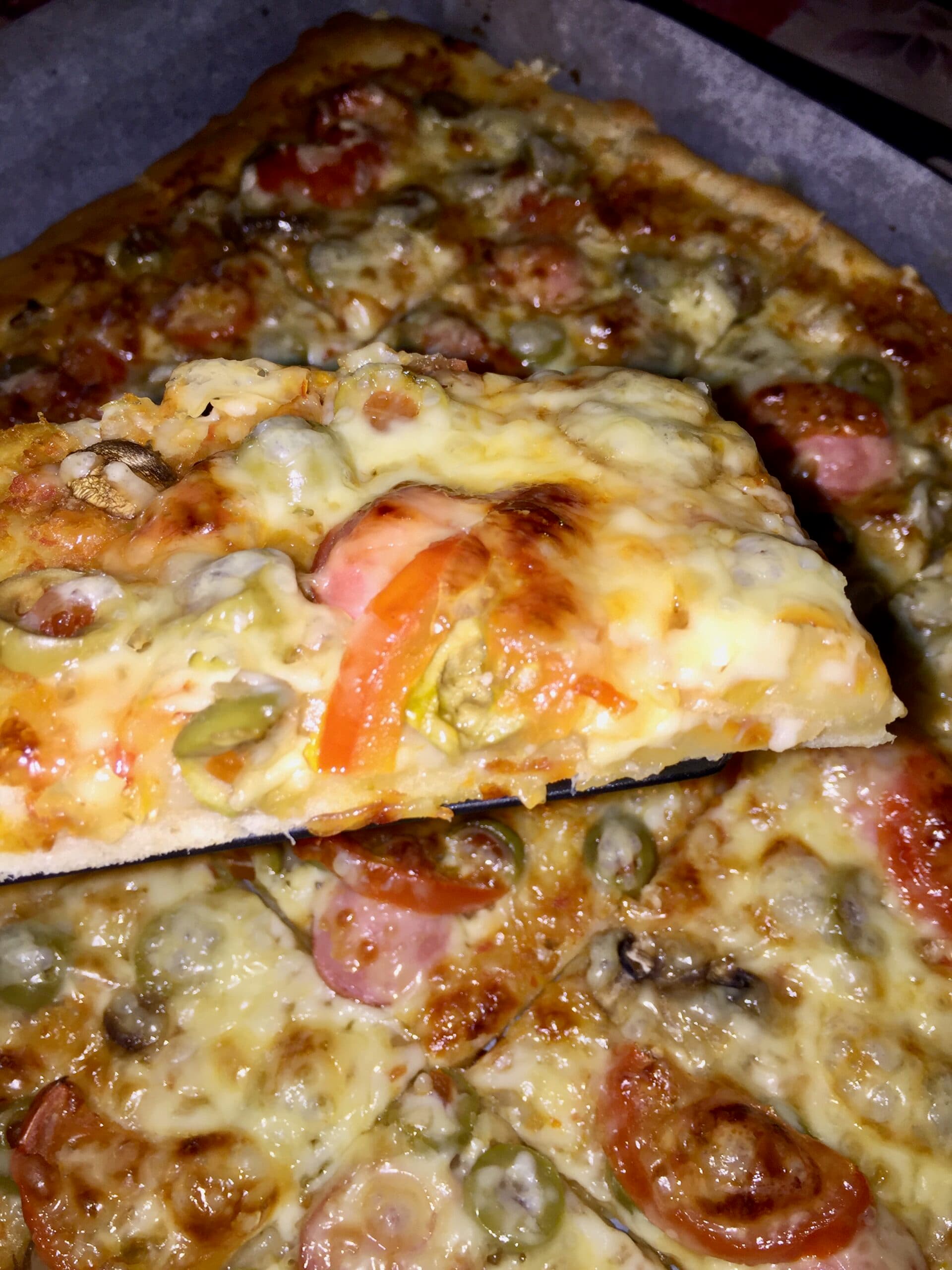 Все ингредиенты сложить в ведерко хлебопечки согласно инструкции. Включить режим «Пицца» (45 минут) или «Пельмени» (20 минут). Противень застелить пергаментом и смазать растительным маслом. Выложить и размять тесто по размеру противня. Смазать соусом, выложить сосиски, оливки, грибы и помидоры. Поспать тертым сыром. Выпекать при температуре 200 градусов до готовности.