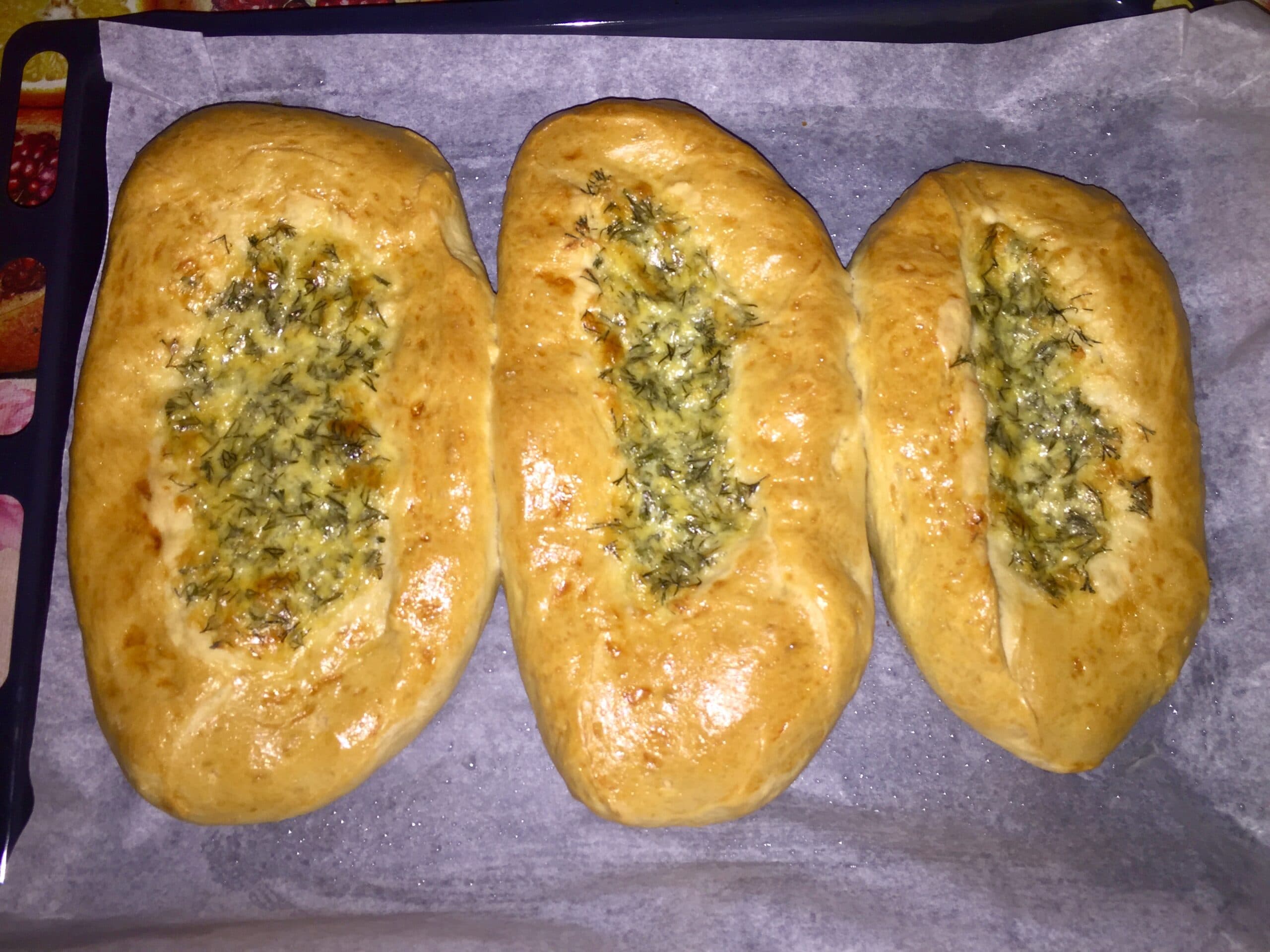 Все ингредиенты для теста складываю в ведерко хлебопечки и включаю режим «Тесто». Время — 2 часа 20 минут. Готовое тесто делим на 3 равные части и формируем лодочки. Противень застилаем пергаментом и смазываем растительным маслом. Выкладываем лодочки из теста. Тертый сыр смешиваем с измельченным укропом и чесноком. Добавляем сметану и соль по вкусу. Перемешиваем. Распределяем начинку по лодочкам. Каждую лодочку смазываем взбитым яйцом. Духовку разогреваем до 180 градусов. Выпекаем лепешки 30-40 минут.