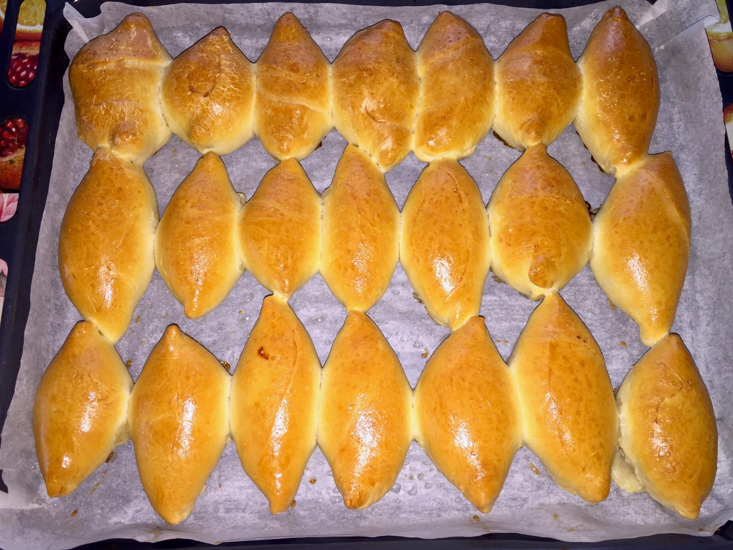 На каждую лепешку выкладываем по 1-2 ч.л. фарша. Лепим пирожок. Противень застилаем пергаментом и смазываем растительным маслом. Выкладываем пирожки. Смазываем взбитым яйцом. На дно духовки ставим миску с водой. Выпекаем пирожки 40 минут при температуре 180 градусов. Приятного аппетита))