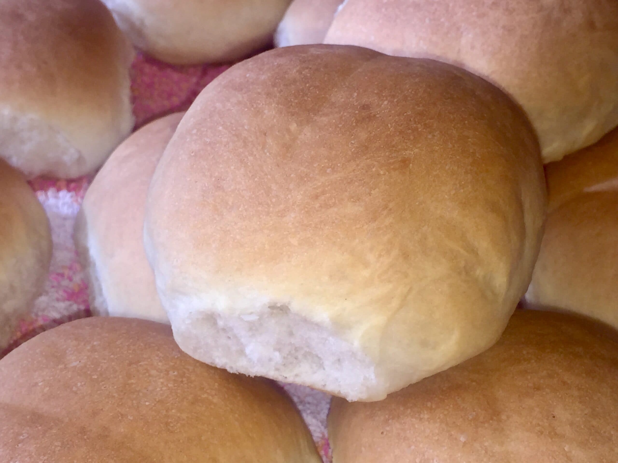 Сливочное масло растопить и остудить. В ведерко хлебопечки сложить все ингредиенты согласно инструкции. Установить программу «Тесто», 2 часа 20 минут. Разделяем тесто на 12 частей. Каждый кусочек весит примерно 75 грамм. Формируем булочки. Противень застилаем пергаментом и смазываем растительным маслом. Тупой стороной ножа делаем углубления на каждой булочке. Ставим булочки на расстойку. Я это делаю в духовке при температуре 30 градусов. Время расстойки — 40 минут. Затем включаем температуру 180 градусов, режим «Верх-низ». Выпекаем 40 минут. Готовые булочки накрываем полотенцем до остывания.