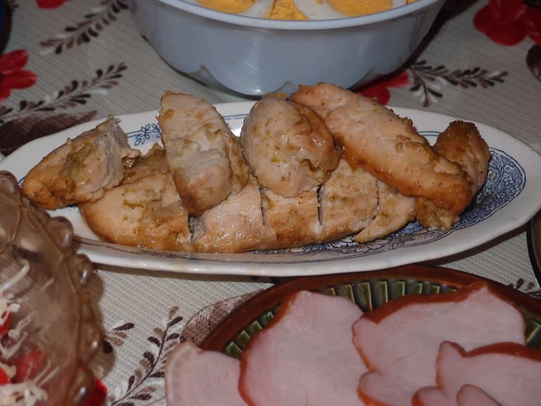 Куриное филе отделяем от кожи, обсушиваем. Натираем смесью специй и соевого соуса. Оставляем на час мариноваться.