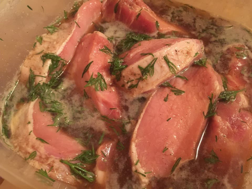 За полчаса до приготовления замачиваем щепу. На дно коптильни выкладываем отжатую щепу, а на решетку верхнего уровня кладем куриное филе. Закрываем коптильню, через 10 минут выпускаем первый дым. Готовим минут 30-40 до золотистого цвета рыбы.