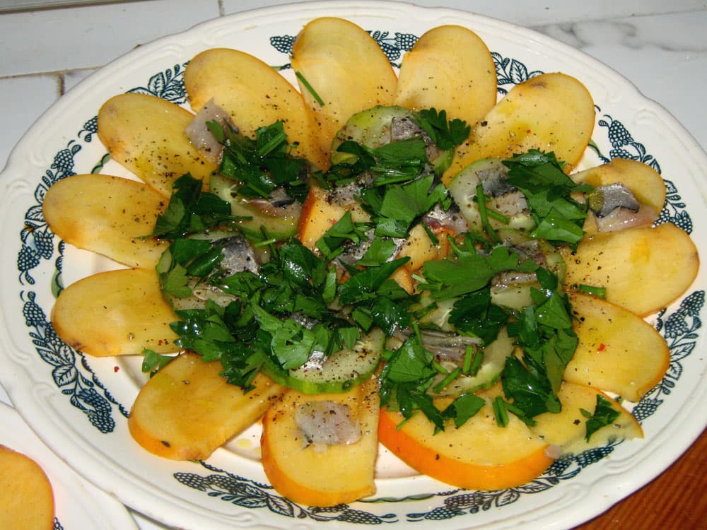 Хурму режем на тонкие дольки и выкладываем на блюдо. Огурец режем колечками и выкладываем сверху. Кильку режем на кусочки и выкладываем сверху огурцов. Посыпаем измельченной зеленью. Посыпаем перцем, поливаем соевым соусом и оливковым маслом.