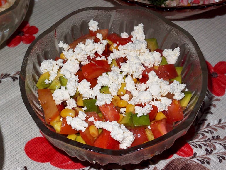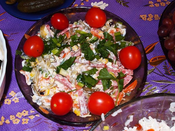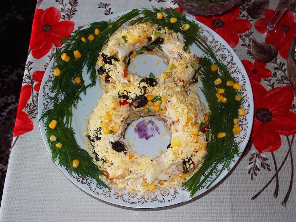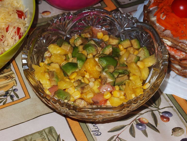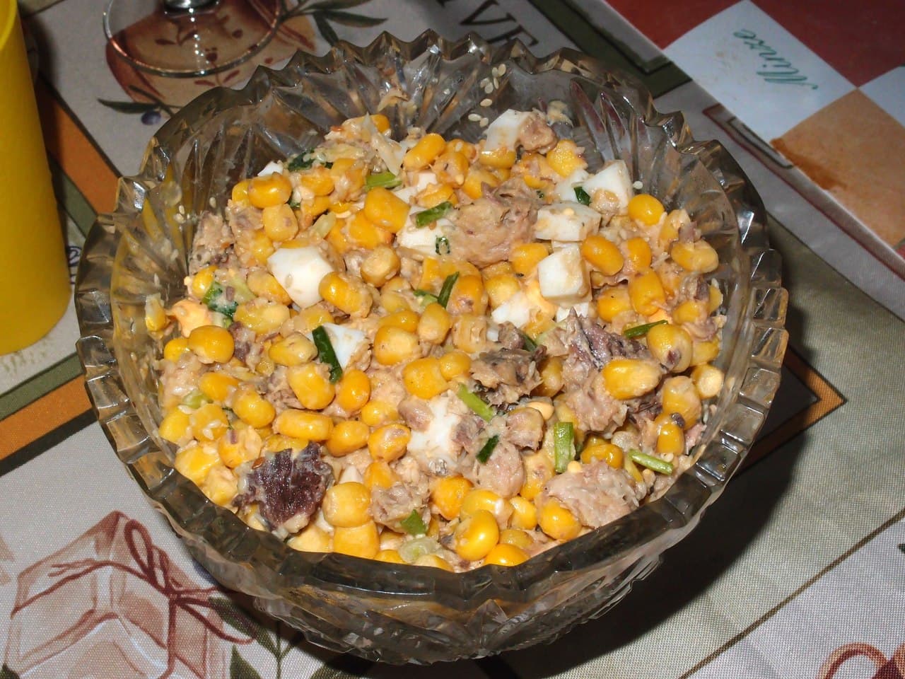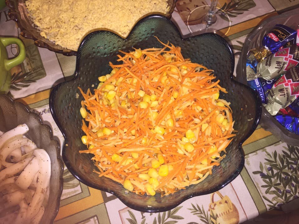 Морковь и сыр натереть на терке «по-корейски», добавить консервированную кукурузу и чеснок, пропущенный через пресс. Заправить майонезом и перемешать.