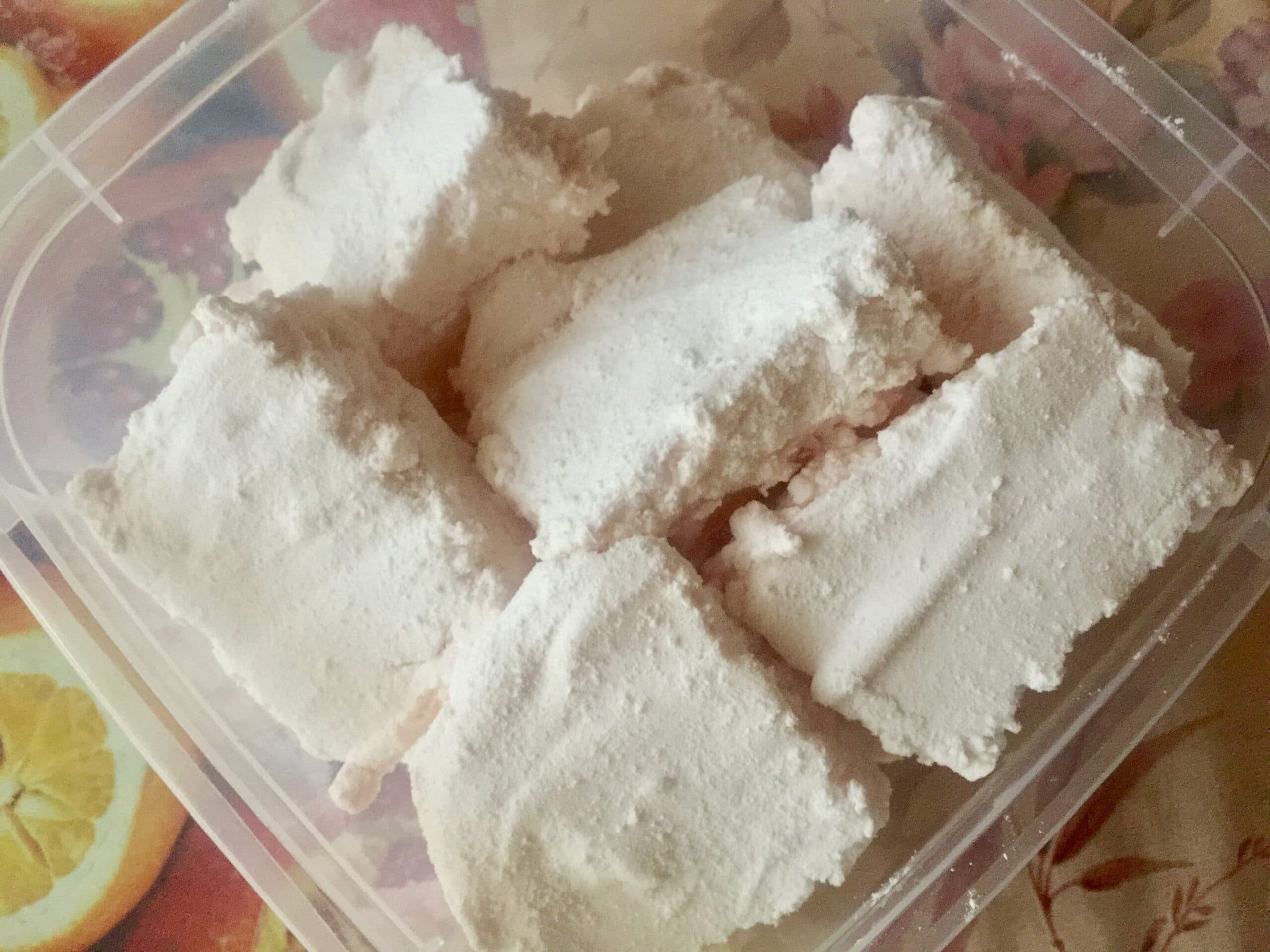 Разрезаем на кусочки и обсыпаем сахарной пудрой и крахмалом.