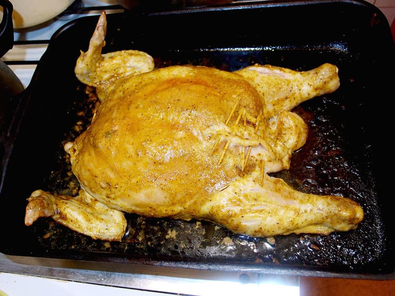 Сначала аккуратно с помощью ножа срезаем шкурку с грудки, затем отрезаем ножки и срезаем шкурку со спинки. Потом обрезаем крылышки и снимаем кожицу, как свитер с тушки курицы.