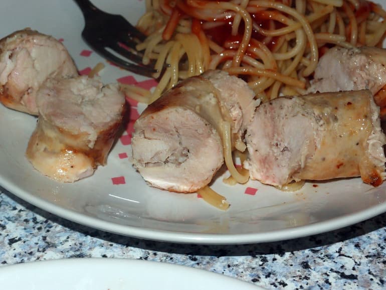 Срезаем мясо с курицы, режем на небольшие кусочки и делаем фарш. Добавляем соль, перец, кориандр, молоко и яйца. Берем блендер и долго делаем бзззз)) Чтобы фарш стал кремообразным. Затем берем пищевую пленку, выкладываем немного фарша, формируем сосиску или сардельку и завязываем по краям. В кастрюле доводим воду до кипения и опускаем туда наши сосиски. Варим 7-10 минут при среднем кипении. Вынимаем, снимаем пленку и даем остыть. Кстати, они вкусные, как горячие, так и холодные.