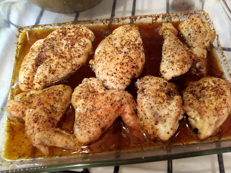 Курицу разрезаем на порционные куски и снимаем шкурку. Выкладываем в форму для запекания. Посыпаем свежемолотым перцем и кориандром, поливаем каждый кусочек соевым соусом и посыпаем специями для курицы. Наливаем в форму воды, чтобы наполовину покрывала курицу. И ставим в духовку на 180 градусов. Выпекаем 40 минут.