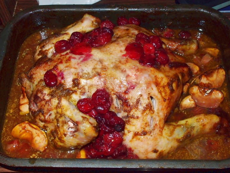 Курицу натереть любимыми специями, полить соевым соусом и оставить мариноваться на пару часов. Кисло-сладкие яблоки очистить от сердцевины и разрезать на дольки. Наполнить курицу яблоками. И по краям можно тоже дольки яблок положить. Поставить курицу в духовку на 180 градусов. Вино смешать с вишнями и довести до кипения. Если вино сильно кислое, то можно добавить немного сахара. Через 15 минут запекания курицу полить вишнево-винным соусом и запекать дальше до готовности около часа.
