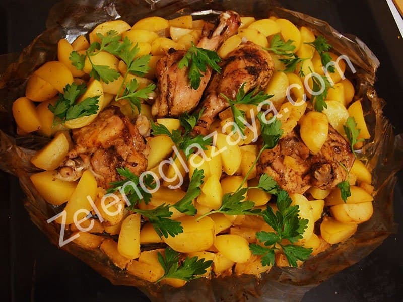 Отрезаем рукав нужных размеров и выкладываем в него окорочка, картофель и ананасы. Завязываем с обеих концов и перемешиваем. Раз 5-6 прокалываем иголкой.