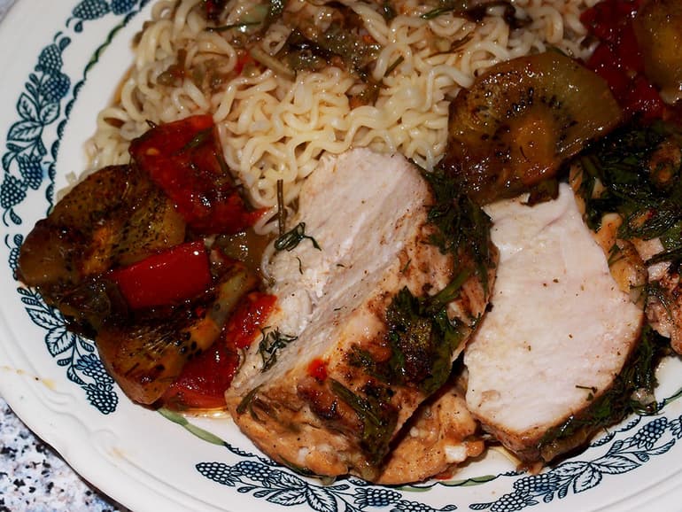Куриное филе режем на небольшие кусочки и обжариваем до румяного цвета. Можно обжарить на гриле без масла.