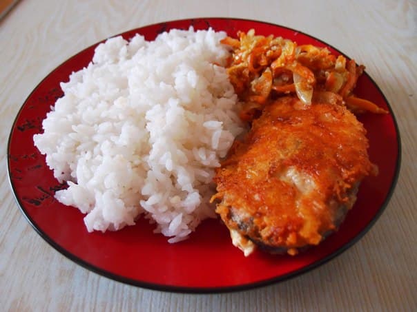 На тарелку выложить рыбу, рядом тушенные овощи. На гарнир подавать рис.