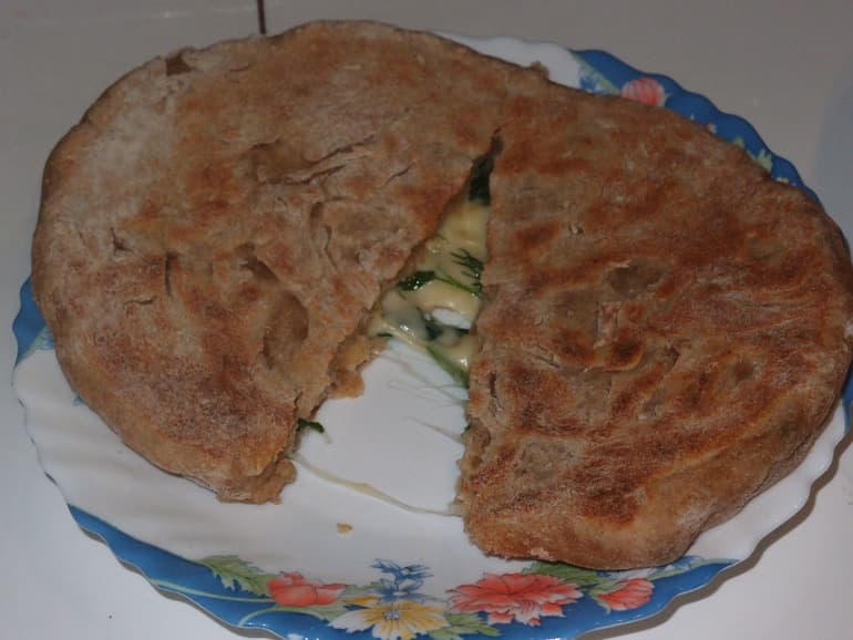 Посыпать рабочую поверхность мукой, выложить тесто, разделить на 4 части. Из каждой части сделать небольшую лепешку толщиной до сантиметра. В центр лепешек положить начинку. Слепить, как для хинкали, и размять до размеров небольшой лепешки. Следить, чтобы тесто не было сильно тонким. Сухую сковородку раскалить и обжарить каждую лепешку с двух сторон до румяной корочки.