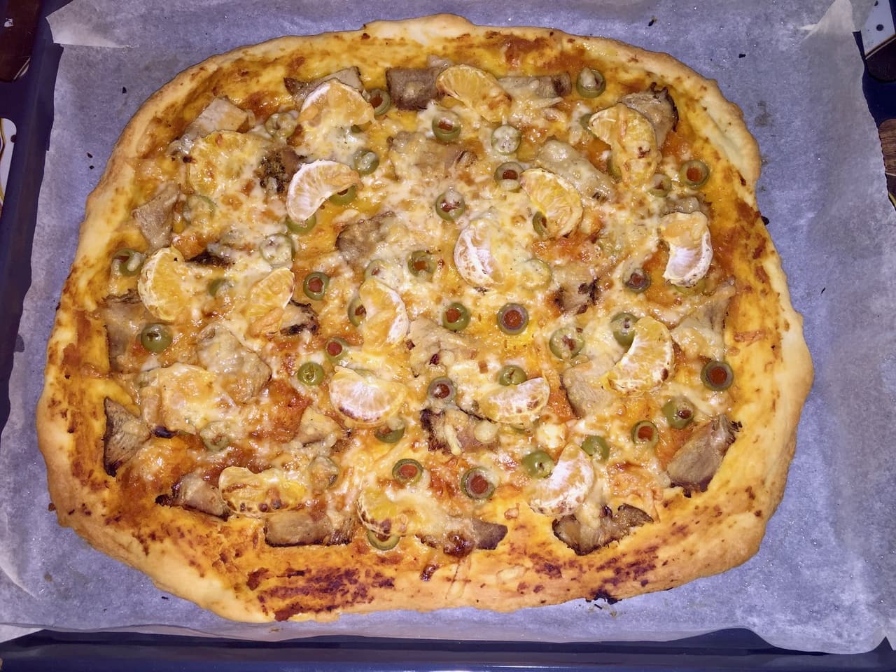 Форму для запекания застилаем пергаментом и смазываем растительным маслом. Выкладываем тесто, разминаем, формируем бортики. Смазываем соусом и выкладываем начинку: буженину, оливки и мандарины. Сверху посыпаем тертым сыром. Духовку разогреваем до 200 градусов и отправляем пиццу в духовку на минут 15.
