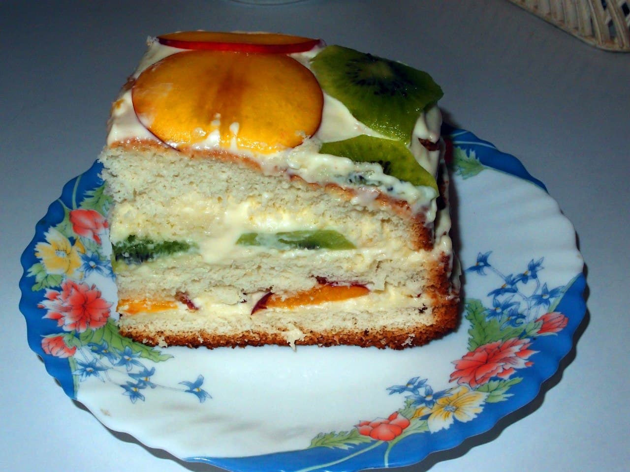 Готовый бисквит вытащить из духовки и извлечь из формы. Дать минут 15 остыть и разрезать острым ножом на 3 коржа. Это надо делать очень осторожно, потому что бисквит очень рыхлый и мягкий. Дать коржам полностью остыть. Затем нижний корж промазать кремом и выложить ломтики нектарина. Второй корж смазать с обеих сторон кремом и накрыть корж с персиками. Далее выложить слой киви. Верхний корж тоже обмазать с двух сторон кремом и накрыть ломтики нектарина. торт обмазать кремом и украсить ломтиками нектарина и киви. Дать пропитаться часик.