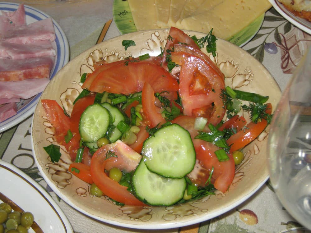 Огурцы нарезаем кольцами толщиной полсантиметра и такими же кольцами нарезаем лук. Огурцы и лук можно брать крупные.